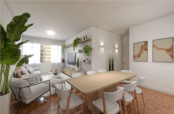 Reformadíssimo esse apartamento encanta! No espaço social temos uma ampla sala com janelão piso teto e vista para o belíssimo edifício Solar do Conde, um dos ícones da arquitetura modernista em Higienópolis. A sala tem um lindo piso em taco mini Parquet, original, que foi cuidadosamente restaurado. A cozinha se integra com a sala de maneira harmoniosa, criando um agradável espaço de convívio social. Na área íntima conseguimos ter um banheiro para cada dormitório (duas suítes e um 3º dormitório com banheiro social). Agende ja a sua visita!