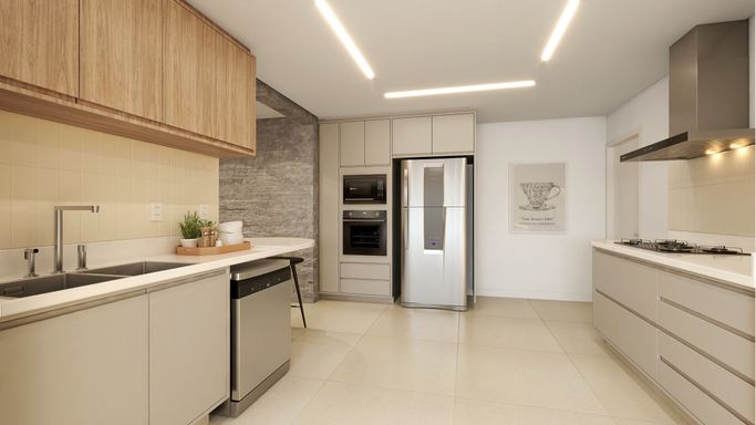 E tem mais: o apê será entregue com tudo pronto onde mais importa — marcenaria nova na cozinha, área de serviço e banheiros, além de cooktop, coifa, forno elétrico, e aquecedor a gás.
