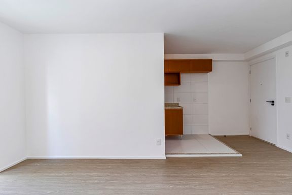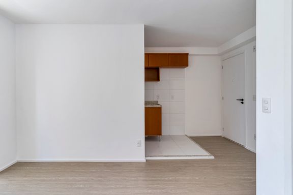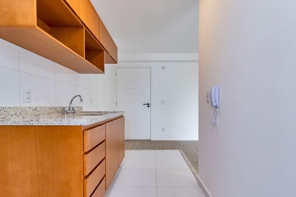 São 41 m² muito bem aproveitados: varanda charmosa, sala integrada, cozinha com armário, dormitório com marcenaria e banheiro completinho.