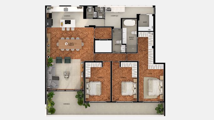 Este apartamento encanta com sua ampla fachada; extensos terraços, e pelas vigas que se projetam aparentes, além do guarda corpo com desenho singular.